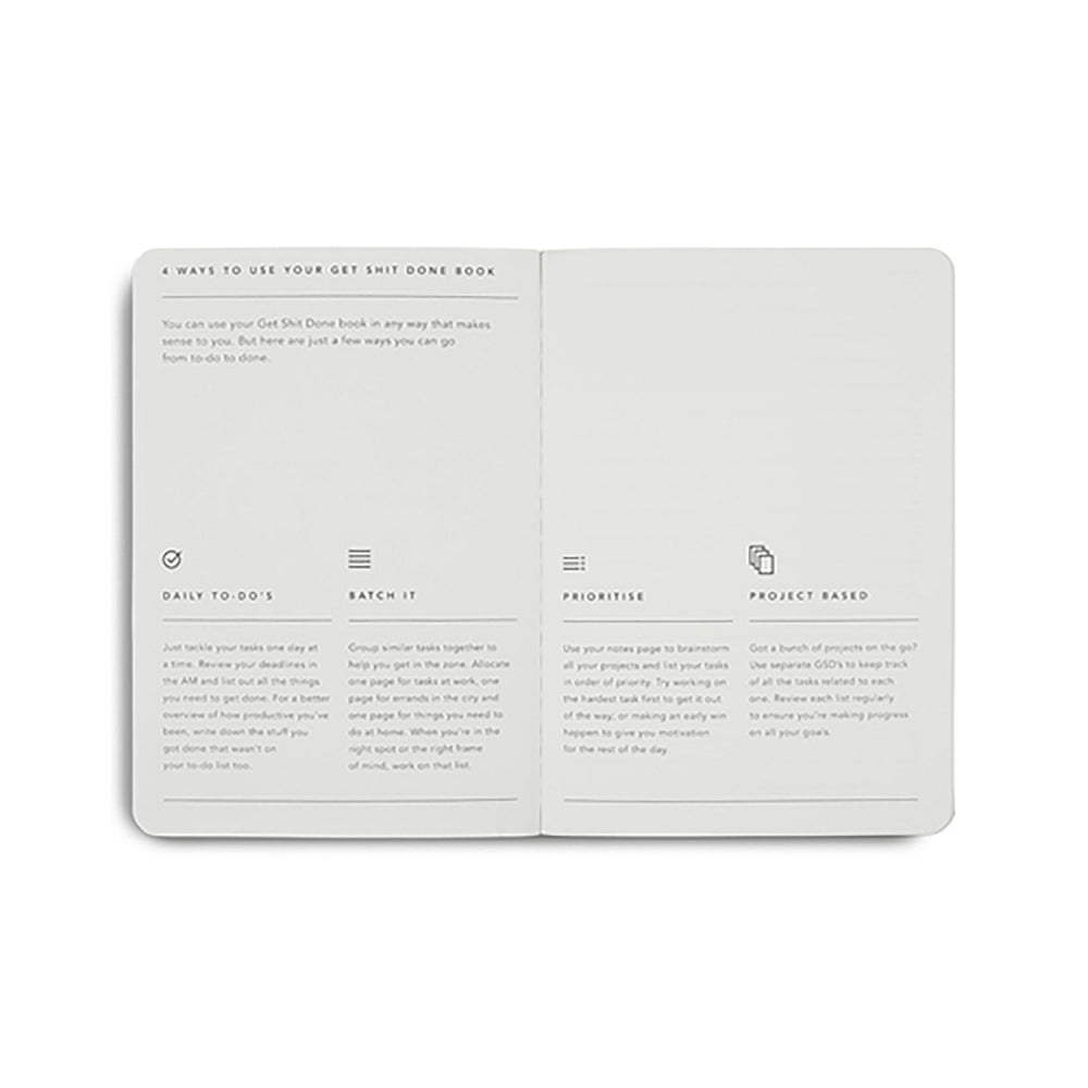 Half to do list, half notebook, your Get Shit Done is small enough to take with you wherever you go. With close to 500 to do list items to tick off, you will be getting a lot done and making big progress in no time. Half to-do list, half lined notes, pocket friendly, affirmations and tips on how to get shit done.