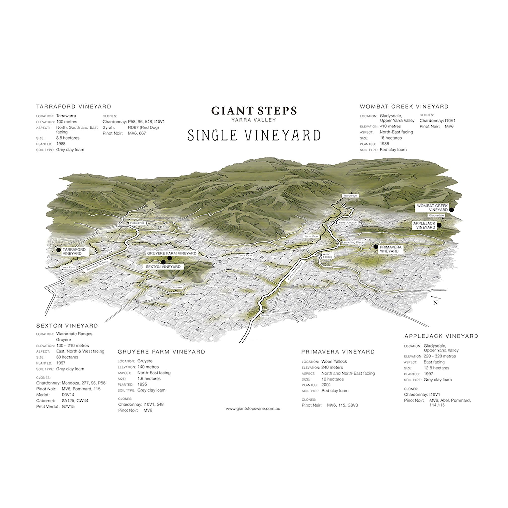 After discovering the Yarra Valley wines 25 years ago, Lou Primavera planted this vineyard in Hoddles Creek in 2001. Located in Woori Yallock sitting at 240 metres. Comprised mostly of fed clay loam with a north and north-east facing slopes. Giant Steps have a long-standing relationship with the Primavera family, having sourced fruit from the vineyard from 2006. This small vineyard has Pinot planted on two slopes of the gully right at the start of the Lone Star Creek – with MV6 planted on north slope and 115 and G-clone on south slope. This vineyard always produced their most floral, red fruited and fragrant Pinot Noir, with a sweetness and softness.