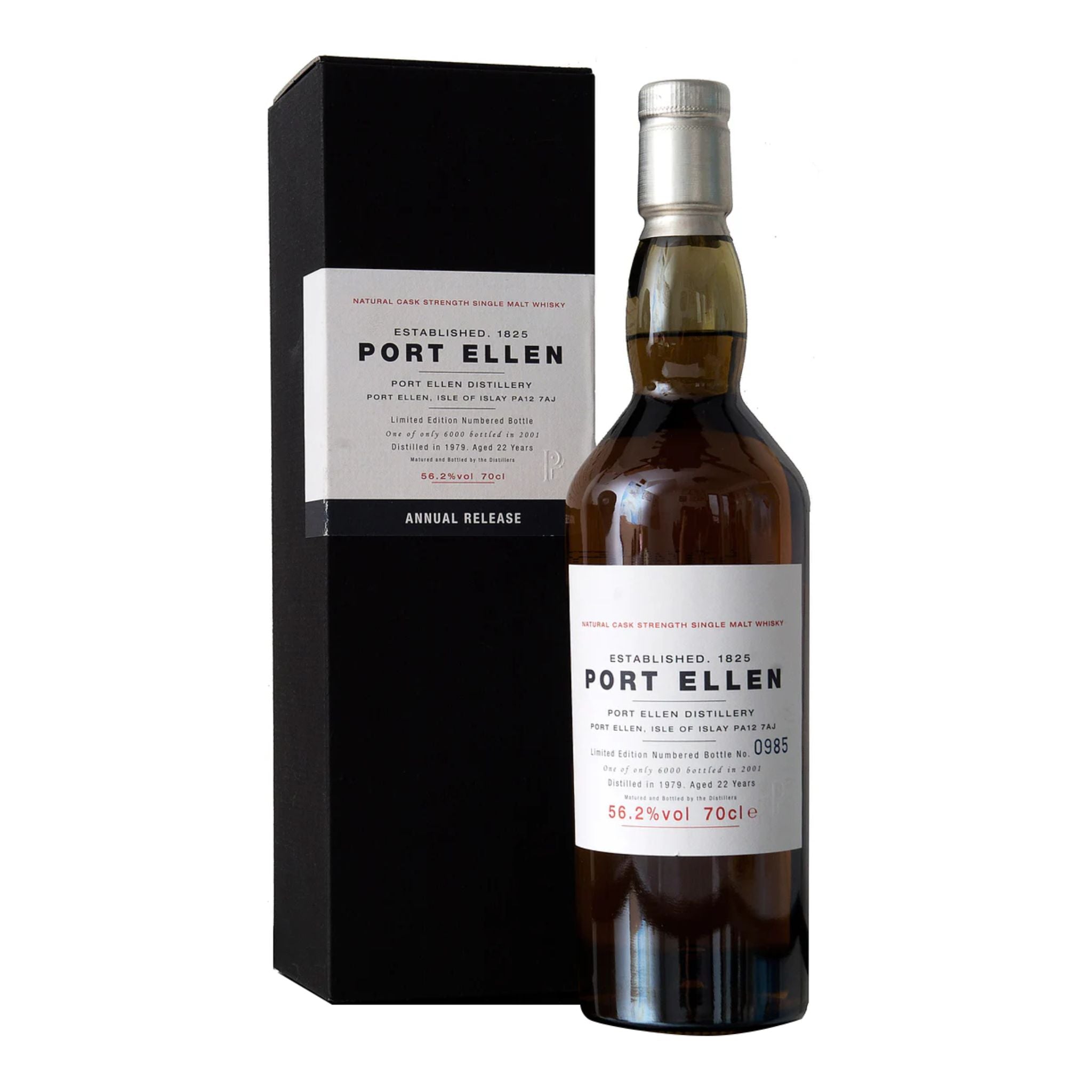 The great Port Ellen Islay Single Malt Scotch Whisky was distilled in 1979, and after 22 years of maturation in selected refill American oak and refill European oak casks, was bottled in the year 2001. Just 6,000 bottles were available at release, all individually numbered and bottled at a natural cask strength of 56.2%. - Don't miss your chance to secure this rare old bottling and very rare collector's whisky.